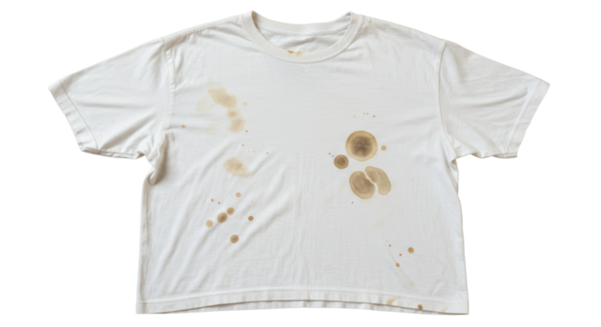 A white t shirt with stains and dirt at the bottom of the shirt on a transparent background isolated png