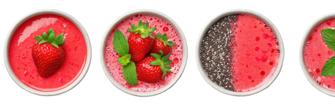 Strawberry smoothie bowls in white bowls, topped with fruit