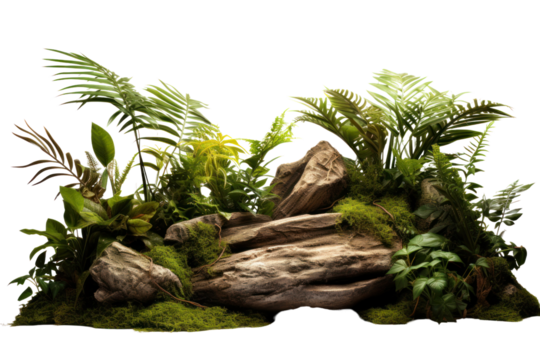 A serene jungle scene featuring a mix of tropical plants, including ferns and moss-covered stones, creating a lush natural setting isolated on white background