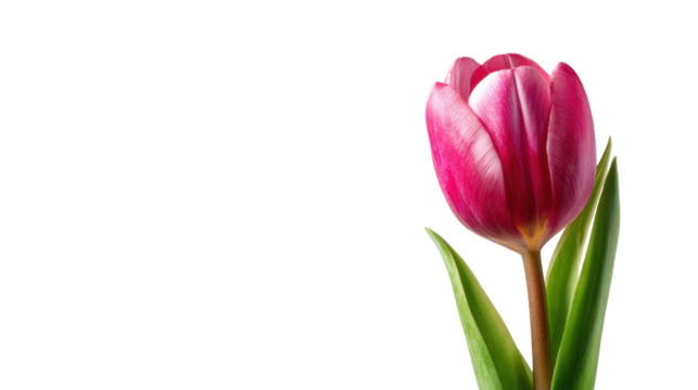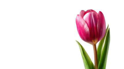 Single pink tulip with green leaves on a white isolated background.