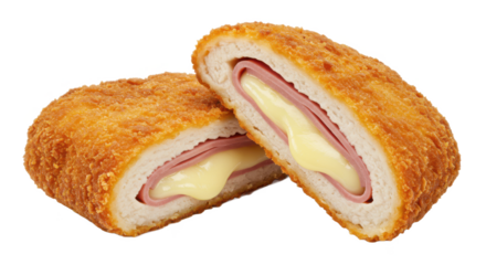 Close up shot of two pieces of cordon bleu showing the ham cheese and breading on a neutral background