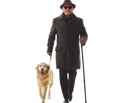 Older man walking with a guide dog, wearing a hat and sunglasses, isolated on white background.  PNG transparent.