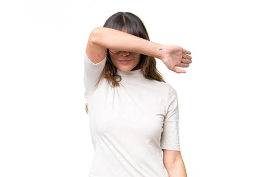 Young caucasian woman over isolated background covering eyes by hands