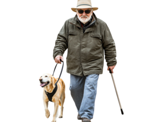 Older man walking with a guide dog, wearing a hat and sunglasses, isolated on white background.  PNG transparent.
