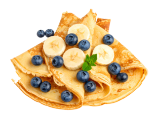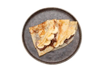 Fresh homemade blinis with chocolate cream, top view isolated on a white background