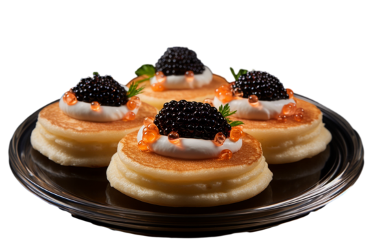 Stack of Mini Blini with Red Salmon Caviar and Cream, Gourmet Appetizer, Isolated on White Background
