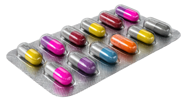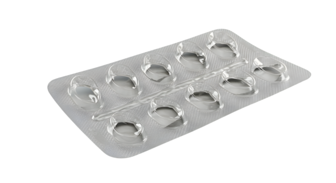 Probiotic supplement blister pack isolated on transparent background, representing health, vitamins, and wellness.