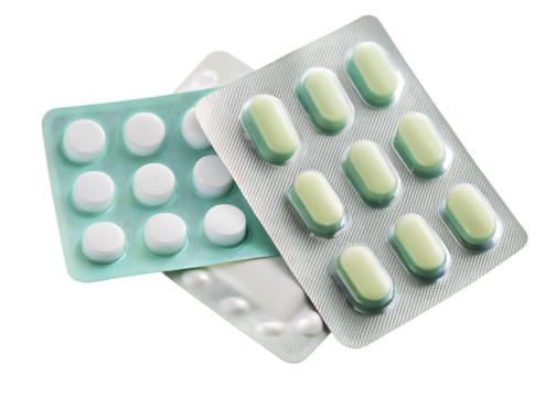 Colorful pill blister packs with tablets in four shades isolated on transparent background