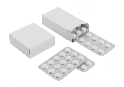Two white cardboard boxes with blister packs of white pills isolated on transparent background