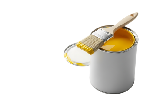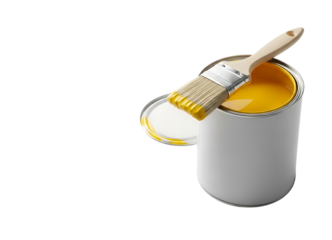 Paint can with yellow paint and paintbrush for home improvement projects Isolated on transparent background