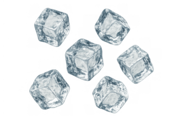 Five clear ice cubes clustered together isolated on a transparent background frozen