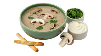 Indulge in Creamy Mushroom Soup with Fresh Herbs and Breadsticks, Perfect for a Cozy Meal and Satisfying Taste, Ideal for Food Blogs and Recipe Sites