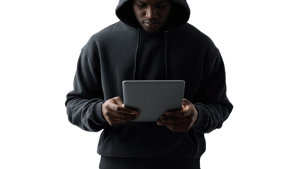 Businessman holding tablet sitting transparent