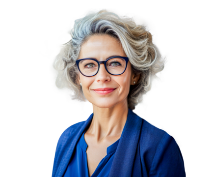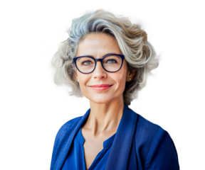 Senior woman with smile in blue suit.