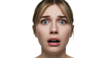 Startled blonde woman with an open mouth and wide eyes expresses fear, concern, or surprise. Isolated against black background.