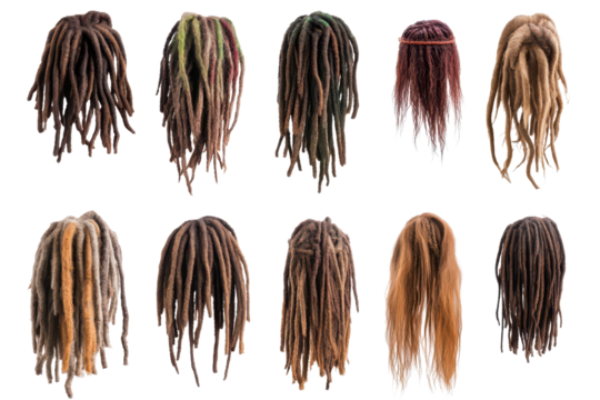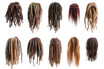 Varied styles of dreadlocks isolated on a white background showcasing different textures and lengths