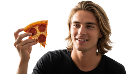Smiling young man with long blond hair holding a slice of pepperoni pizza isolated on transparent background