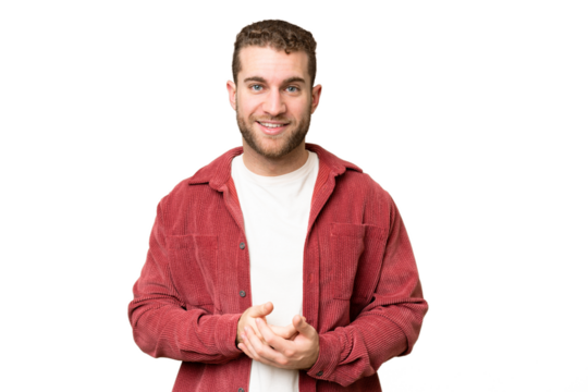 Young handsome blonde man holding a wallet over isolated chroma key background smiling a lot
