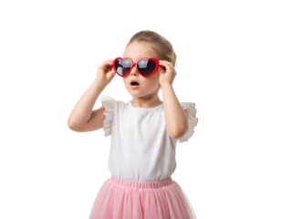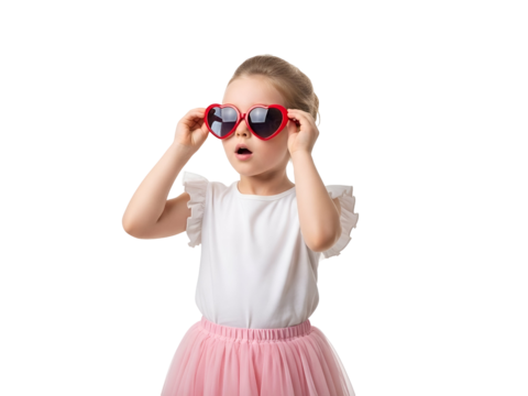 Adorable young girl with blonde buns in a pink skirt and white top, expressing surprise while holding stylish red heart-shaped sunglasses, isolated on transparent background.