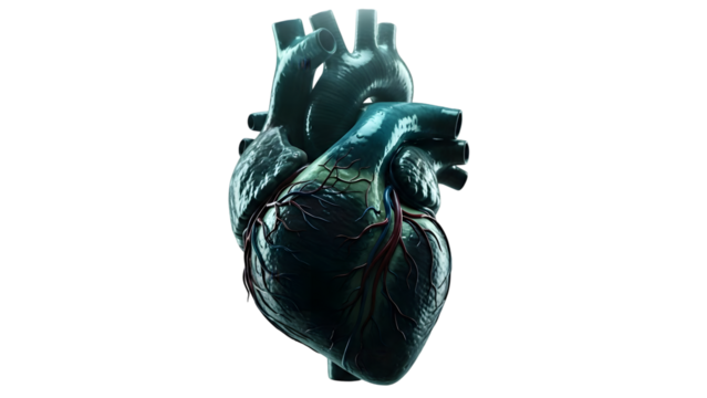 Detailed dark blue 3D render of a realistic human heart anatomy with visible arteries and veins, isolated on a Transparency background. Cardiovascular health and medical concept