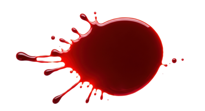 Red blood stain with splatter and drops, isolated on transparent cutout background