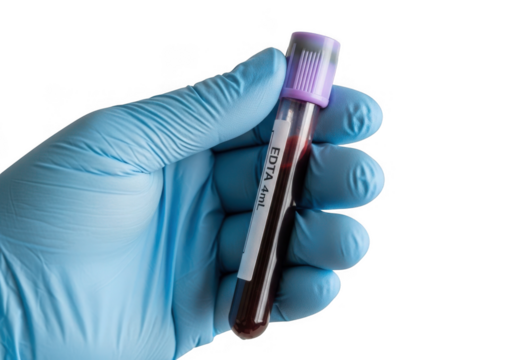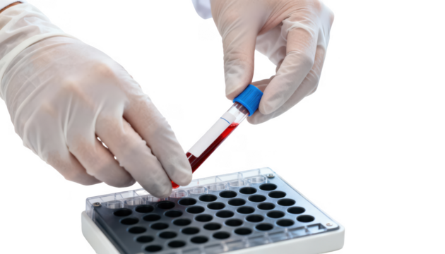 Medical professional wearing white gloves holds a blood sample in a test tube isolated on transparent background