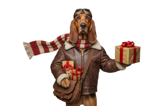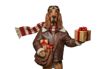 Bloodhound Dog Dressed as Pilot with Christmas Gifts