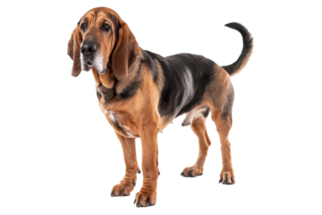 Bloodhound dog standing and looking at camera, isolated on a white background