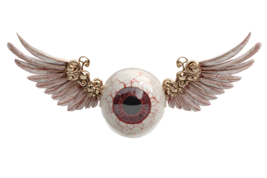 A flying eyeball with detailed wings and red veins.