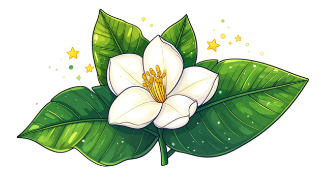 Vibrant illustration of a white flower, surrounded by green leaves and whimsical sparkles