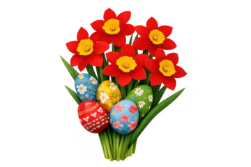 Colorful easter eggs and red daffodils bouquet on transparent background