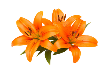 Three vibrant orange lilies with green leaves and prominent stamens.