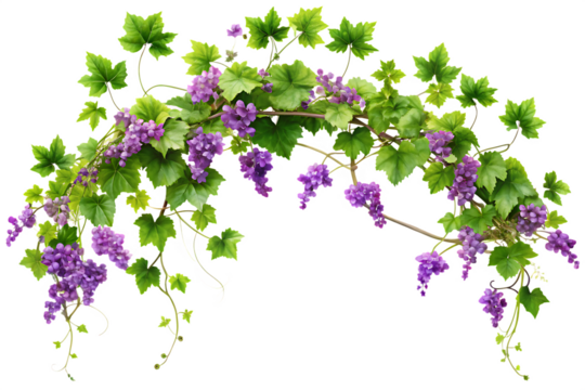 Hanging green plants and lush foliage with purple and white flowers providing natural decoration, transparent background