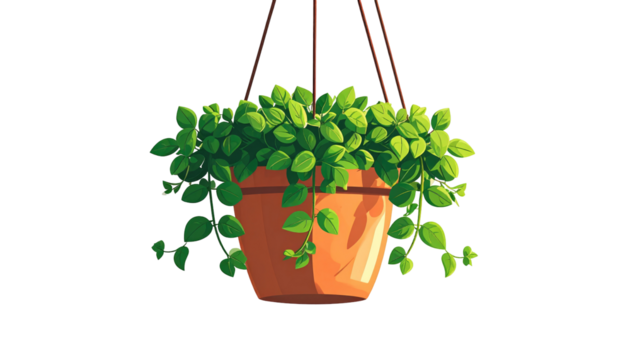A vibrant hanging plant in a terracotta pot, showcasing lush green foliage and delicate vines. It is against a transparent background