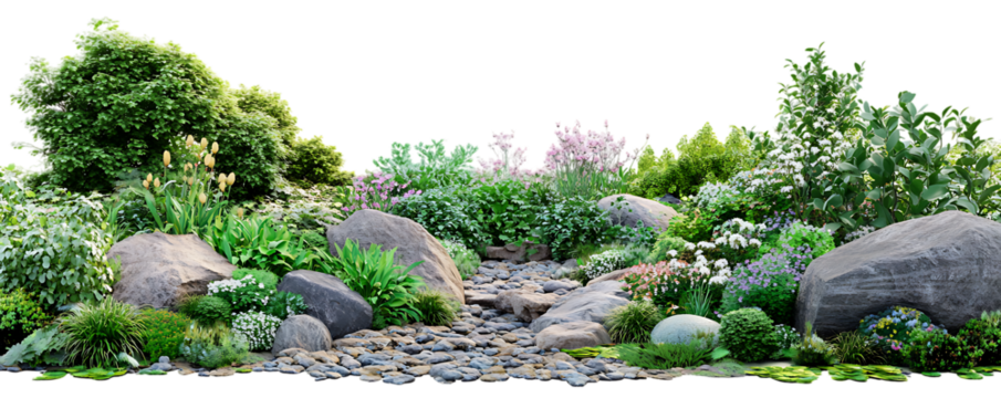 A vibrant landscape featuring lush greenery rocks and a small stream