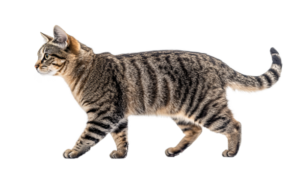 Sweet silver tabby British Shorthair cat kitten, sitting up facing front. Looking towards camera with big eyes. Isolated cutout on transparent background.