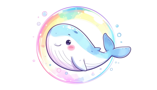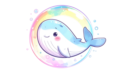 A cute, light blue cartoon whale inside a rainbow-colored bubble, black background