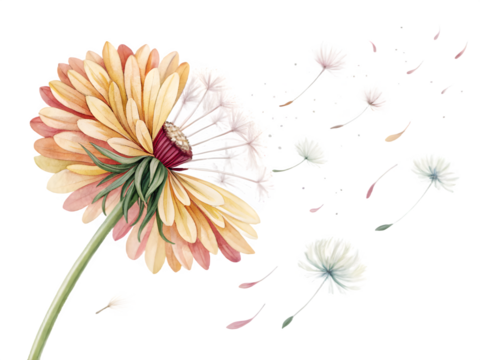 Gerbera daisy with dandelion seeds blowing away on black background