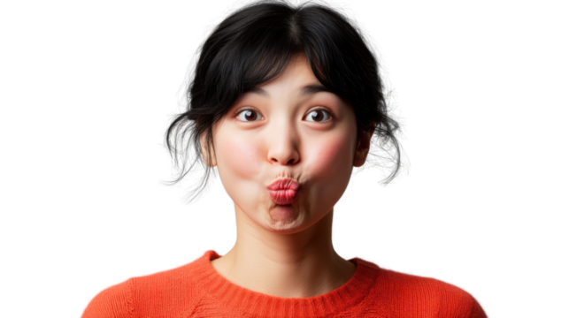 a 20 year old woman with extremely puckered lips blowing air, cheeks sucked inward, wide eyes, on a white background