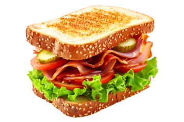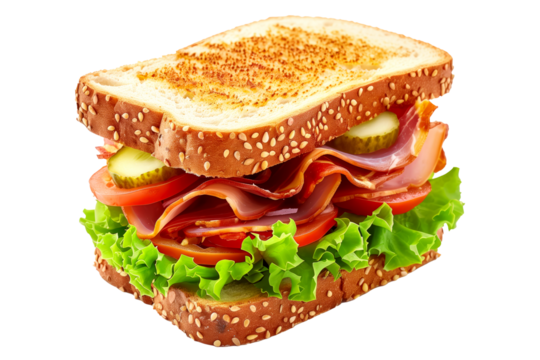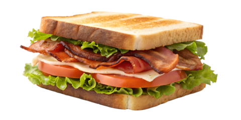 A delicious blt sandwich with crispy bacon, fresh lettuce, and ripe tomato on toast on transparent background