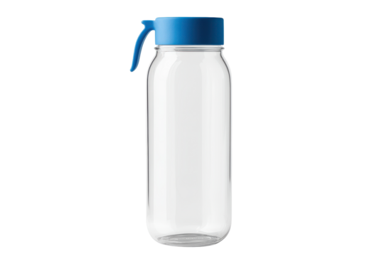 Clear reusable water bottle with blue lid and handle isolated on transparent background. Clear plastic water bottle with blue lid isolated on white background.