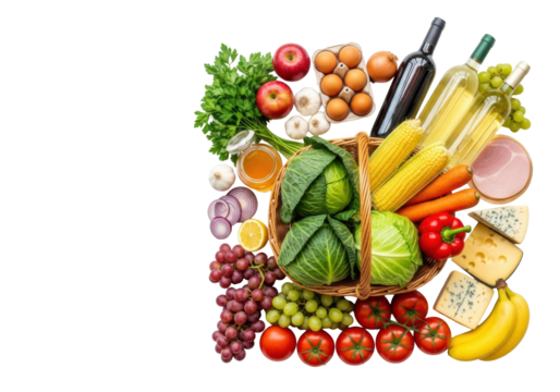 Rustic wicker basket overflowing with vibrant fresh produce, gourmet items, wine on a transparent background with copy space, concept of healthy eating and culinary variety
