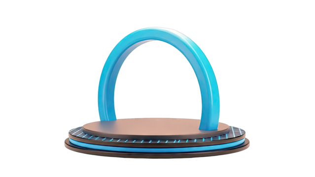 3D rendered archway of stacked, translucent blue arcs with internal neon lights