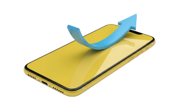 Yellow smartphone with blue arrow isolated PNG, mobile device mockup on transparent background for app promotion and technology concepts