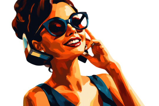 Cheerful woman listening to music on smartphone with green headphones transparent background