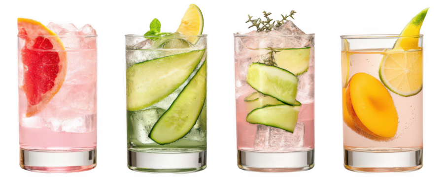 different types of cocktails in glasses with ice and garnishes, png, transparent