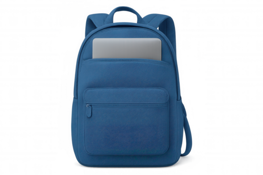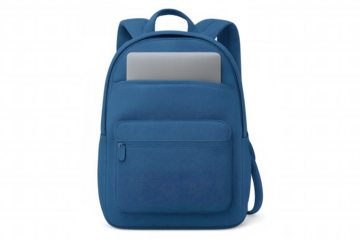Blue backpack with laptop in outer pocket on transparent background, perfect for students and professionals