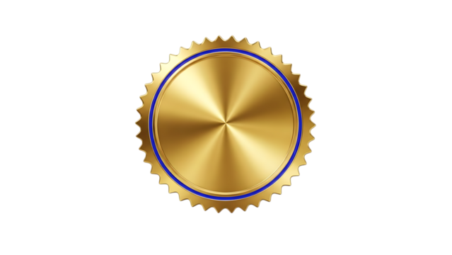 Golden seal with blue border on transparent background, offering copy space for customization and branding