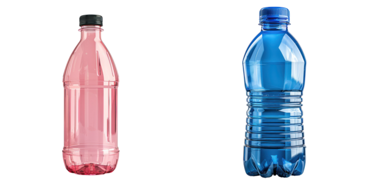 Two plastic water bottles in pink and blue colors, ideal for showcasing hydration, drink options, and beverage packaging. transparent background