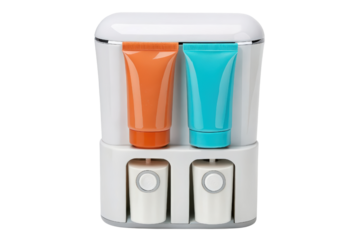 Wall-mounted dual soap dispenser with orange and blue bottles isolated with transparent background